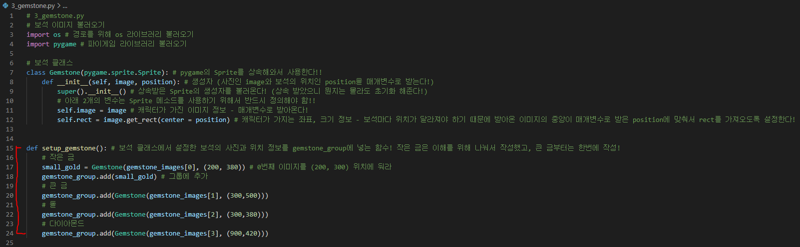 생성자의 명령문 안에는 Sprite의 생성자를 불러오고, gemstone의 image와 rect정보(좌표와 크기정보)를 각각 self.image와 self.rect에 저장합니다.