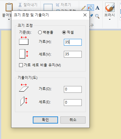 다시 그림판을 켜서, 35*35 크기의 캔버스를 만들고 빨간 색을 안에 칠해줍시다.