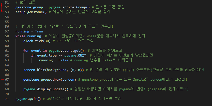 모두 만들었다면 게임이 작동하는 while문 안에 Sprite를 스크린에 그리는 코드를 작성합니다. (67줄)