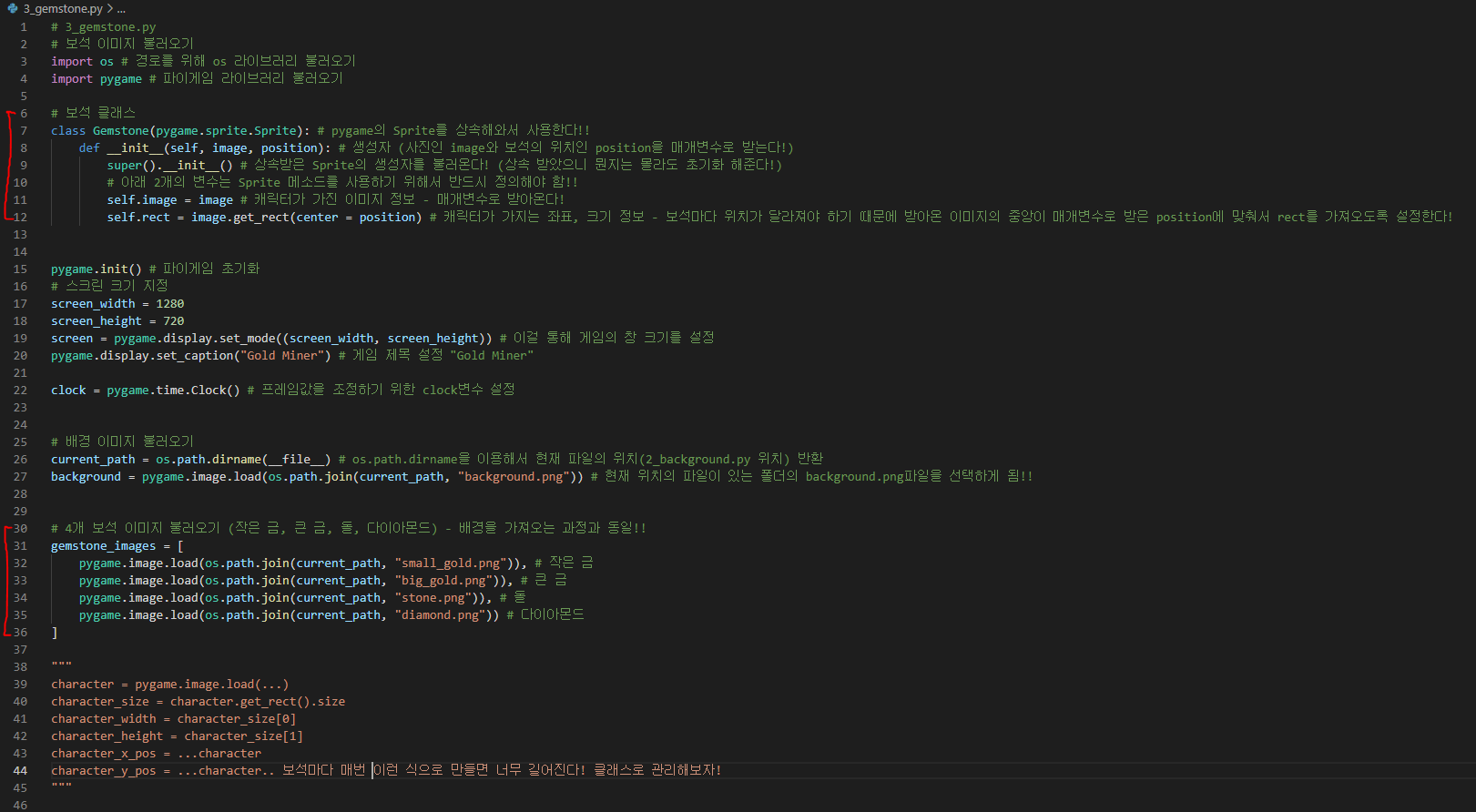 character_y_pos = ...character.. 보석마다 매번 이런 식으로 만들면 너무 길어진다! 클래스로 관리해보자!