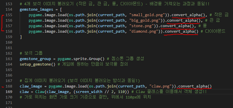보석의 이미지를 불러오는 부분과 집게의 이미지를 불러오는 부분에 모두 convert_alpha 메소드를 넣어줍니다.
