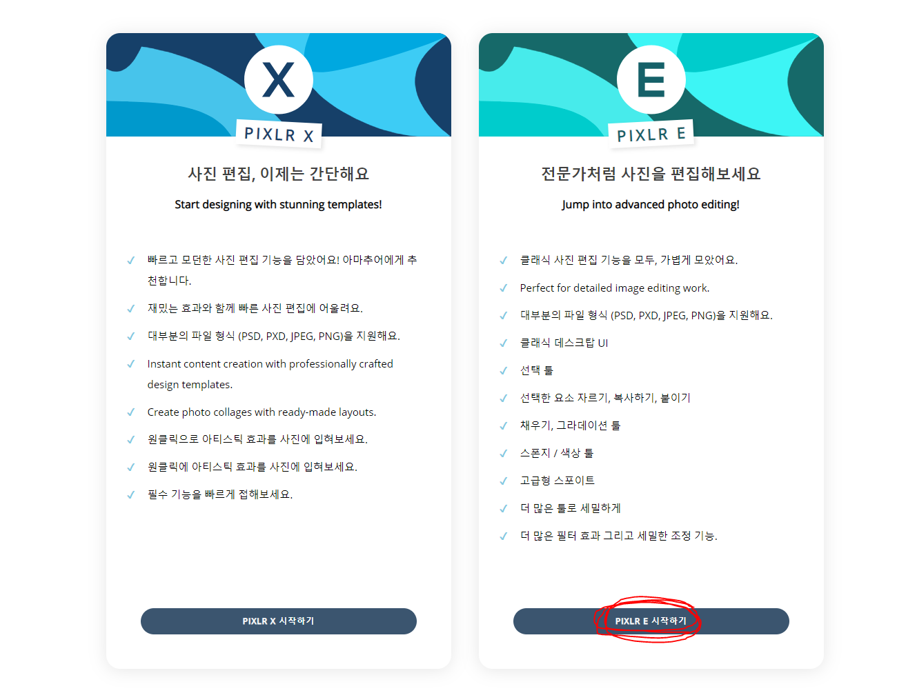 위에 올려드린 링크로 들어가시면 PIXLR X와 PIXLR E가 있는데, 오른쪽에 있는 PIXLR E를 눌러줍니다.