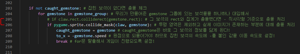 if claw.rect.colliderect(gemstone.rect): # 그 보석의 rect와 집게가 충돌했다면 - 직사각형 기준으로 충돌 처리