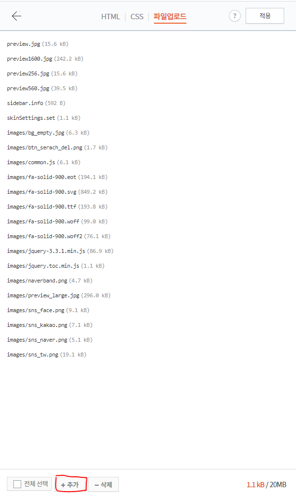 이걸 받아서 이젠 친숙한 html 편집의 파일 업로드에 들어가서 맨 아래 있는 추가 버튼을 눌러서 파일을 업로드해줍니다.