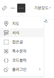 이렇게 저장한 서식을 실제로 사용 할 때에는, 글쓰기 상태에서 점 3개 버튼을 눌러서 서식 버튼을 누르면 방금 저장했던 목차 서식이 나옵니다. 이걸 원하는 위치에 불러와서 사용하면 됩니다.