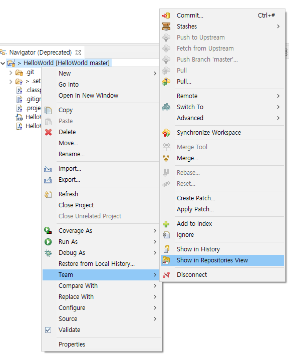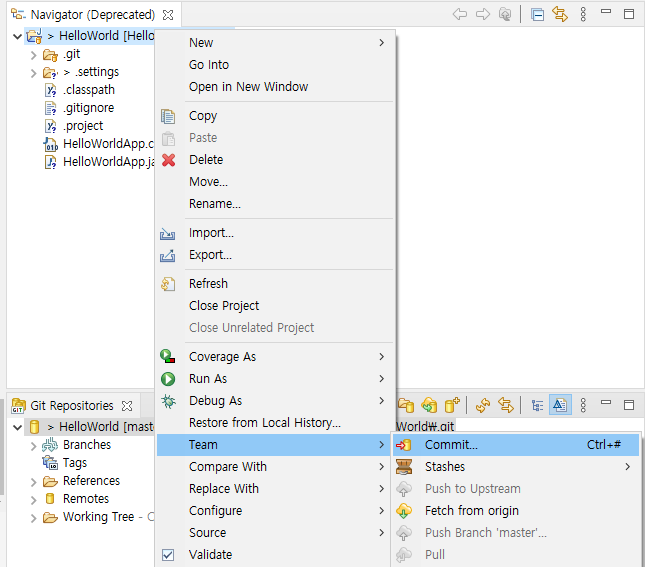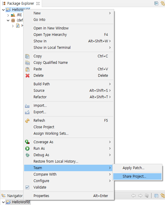 프로젝트 폴더에서 오른쪽 단추를 누르고 Team > Share Project로 들어갑니다.