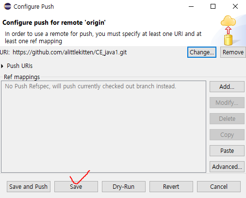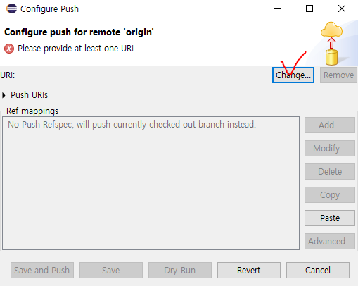 Configure Push창이 뜨면, Change 버튼을 눌러줍니다.