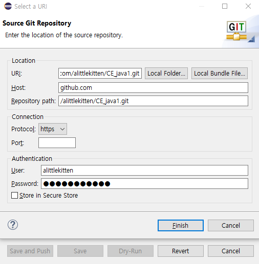 그리고 github 아이디와 비밀번호도 입력해준 후에 Finish버튼을 눌러줍니다.