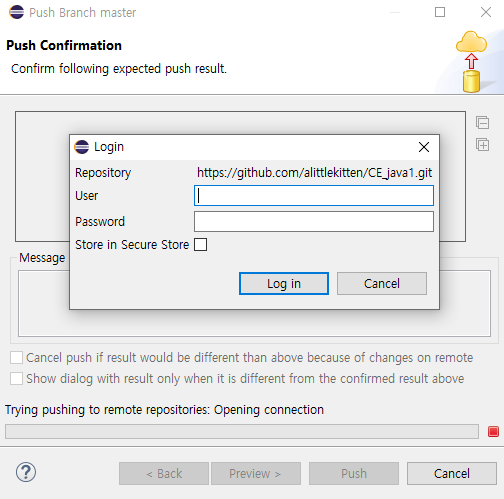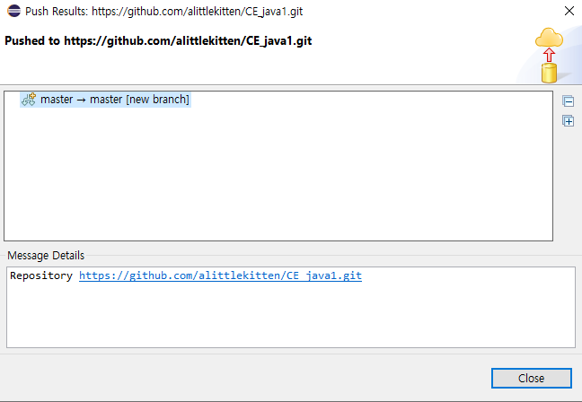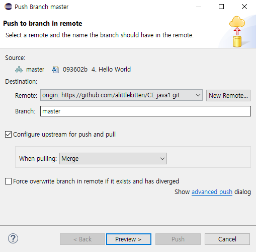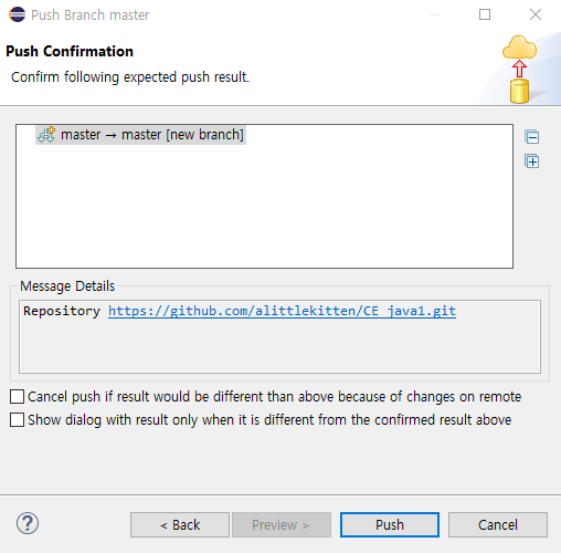 원하는 Branch와 원격저장소가 잘 설정되었는지 확인하고 Push 버튼을 누르면 끝입니다!