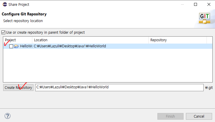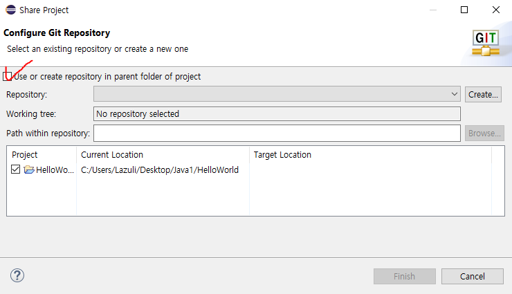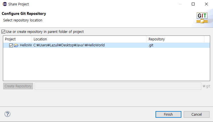 경로 설정을 위해 위엥서 프로젝트 폴더를 선택하면 아래쪽에 .git이 생성되는 경로가 뜹니다.