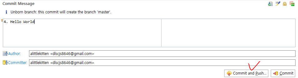 오른쪽에 어떤 내용을 commit하는지 간단하게 메시지를 남기고 Commit and Push 버튼을 눌러줍니다.