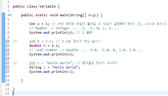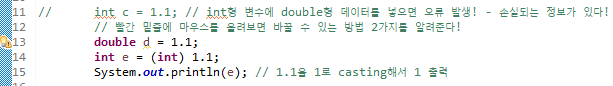 // int c = 1.1; // int형 변수에 double형 데이터를 넣으면 오류 발생! - 손실되는 정보가 있다!