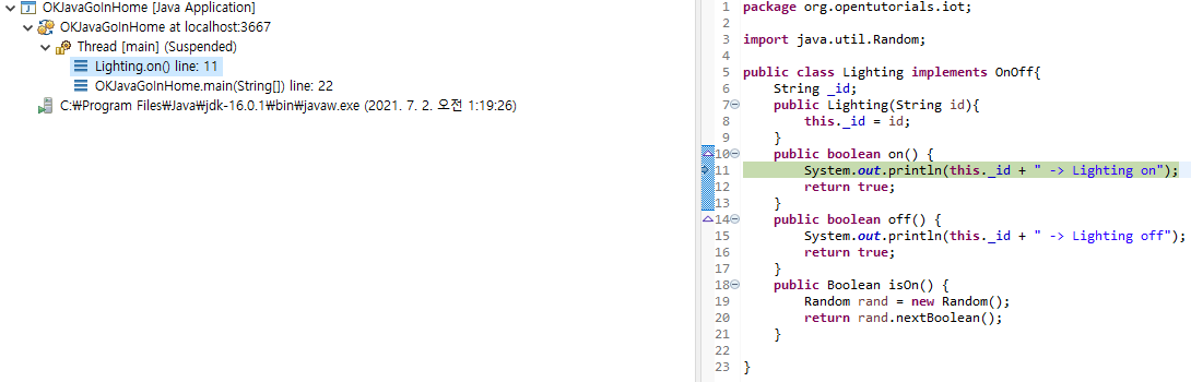 이번엔 hallLamp라는 Lighting이 어떻게 켜지는지를 확인하기 위해서 hallLamp.on()에다가 브레이크 포인터를 걸어줍니다.