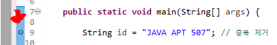 다음 줄로 넘어가고, 오른쪽 변수에도 id에 JAVA APT 507이 할당된 것이 보이시죠!