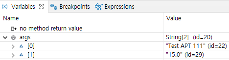 args라는 배열의 0번 데이터를 사용하고 싶다면 args[0]을 원하는 곳에 넣어주면 됩니다.
