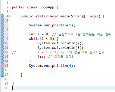 // i = i + 1; // i의 값을 1씩 증가시킨다