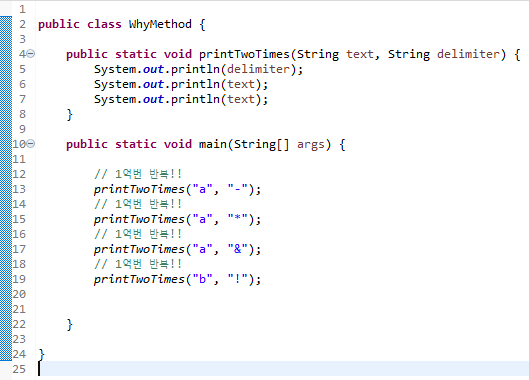 WhyMethod 클래스에서 만들었던 printTwoTimesA() 메소드를 조금 바꿔봅시다.