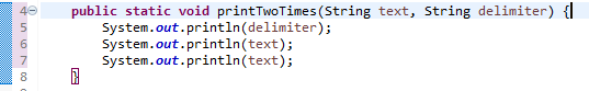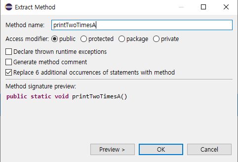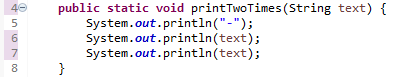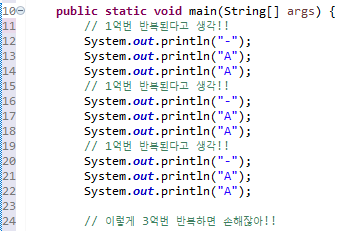 이렇게 만들고 System.out.println() 3번 대신 printTwoTimesA() 1번을 넣어줍니다.