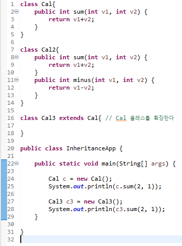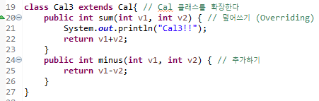 이렇게 되면 Cal3라는 클래스는 Cal 클래스의 내용을 따로 복사하지 않고도 그대로 사용할 수 있게 됩니다.