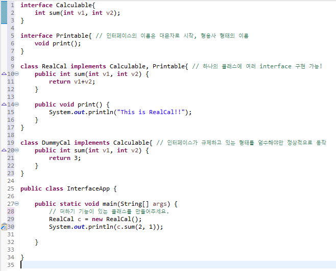 class RealCal implements Calculable, Printable{ // 하나의 클래스에 여러 interface 구현 가능!