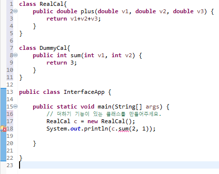 인터페이스를 지키기 위해서는 우리가 구현하지 않고 선언만 해준 sum을 완벽하게 구현되도록 만들어야만 합니다.