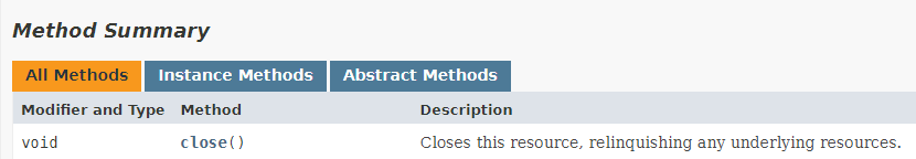 이 말은 AutoCloseable 인터페이스를 implements한 모든 클래스는 close()라는 메소드가 구현이 되어있다는 말과 같습니다.