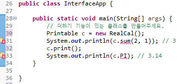 이렇게 만들면 c라는 인스턴스에서는 Printable에서 선언한 print 메소드는 사용할 수 있지만, Calculable에서 선언한 PI 변수와 sum 메소드는 사용할 수 없습니다.