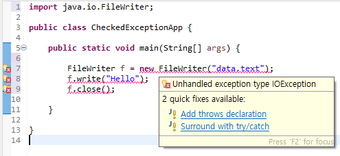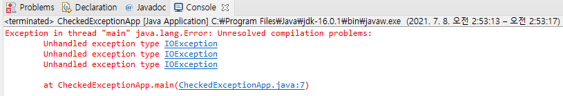 IOException은 checked exception이기 때문에 처리를 하지 않으면 프로그램이 실행되지 않습니다.