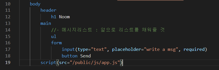 먼저 home.pug에서 메시지를 담을 수 있는 input box와 send button을 만들어줍니다.