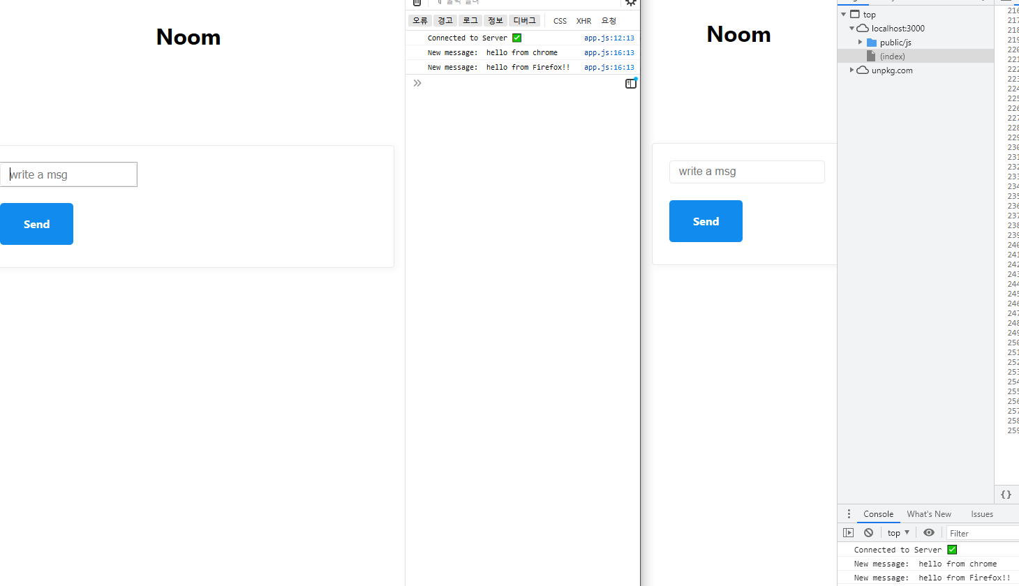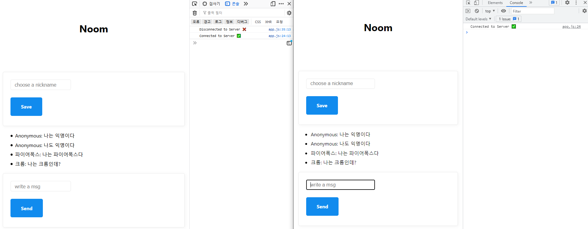 이제 서버를 실행하고 두 브라우저에서 확인해보면, 정상적으로 닉네임이 설정되고 메시지가 출력되는 모습을 확인하실 수 있습니다!!