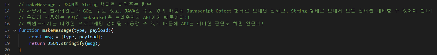 또 하나의 문제가 있는데, 서버로 보내는 메시지는 반드시 String 형태여야 합니다. (우리가 만든 프로그램이 반드시 JS으로 구현된 브라우저에서만 사용될 것은 아니니까요!)