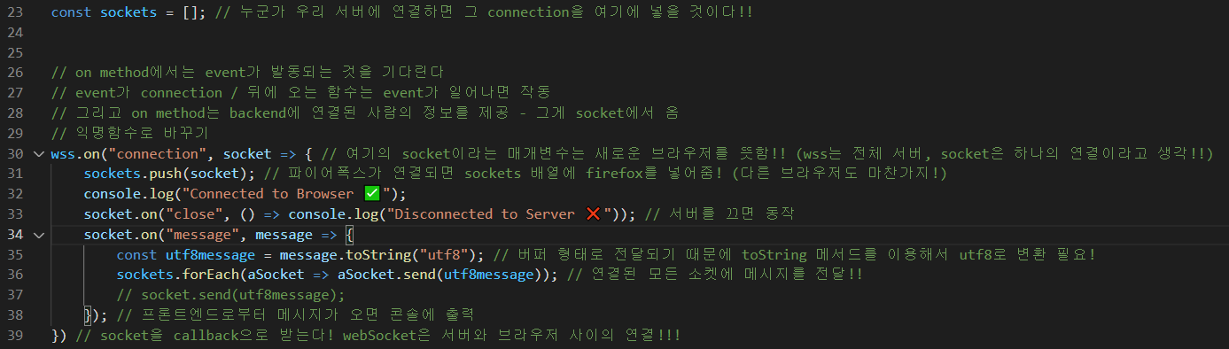 wss.on("connection", socket => { // 여기의 socket이라는 매개변수는 새로운 브라우저를 뜻함!! (wss는 전체 서버, socket은 하나의 연결이라고 생각!!)