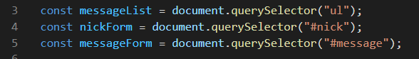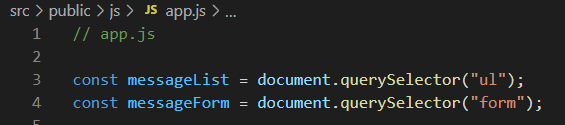 home.pug에서 설정한 ul 내의 form들의 모임을 각각 messageList, messageForm으로 받아옵니다.