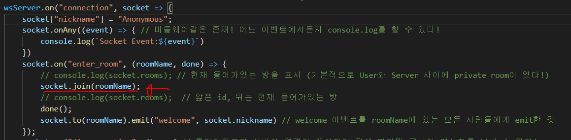 socket.to(roomName).emit("welcome", socket.nickname) // welcome 이벤트를 roomName에 있는 모든 사람들에게 emit한 것