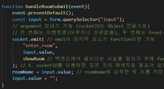 }); // 백엔드로 new_message 이벤트를 날림, (input.value이랑 방이름도 같이 보냄!), 마지막 요소는 백엔드에서 시작시킬 수 있는 함수!