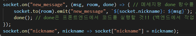 socket.on("new_message", (msg, room, done) => { // 메세지랑 done 함수를 받을 것