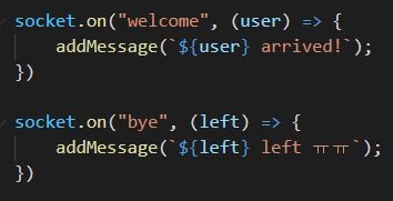 socket.on("new_message", addMessage); // addMessage만 써도 알아서 msg를 매개변수로 넣는다!