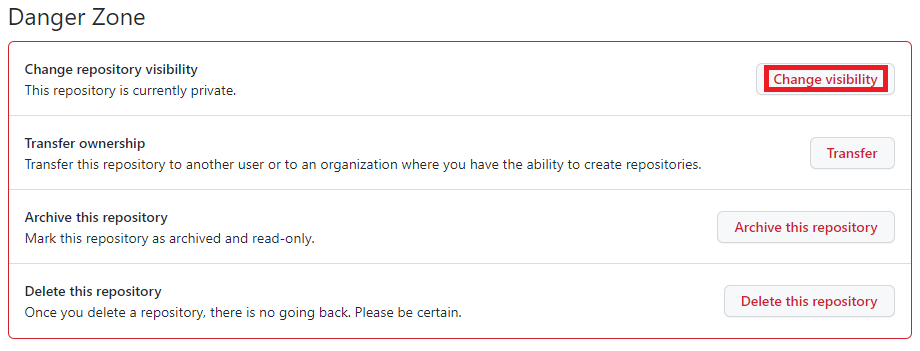 Private 레포지토리를 Public상태로 바꾸기 위해서는 Change visibility 버튼을 누르셔야 합니다!