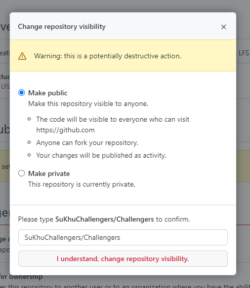 여기서 원하는 상태를 누르고 아래에 메시지를 타이핑하고 I understand, change repository visibility 버튼을 눌러줍니다!