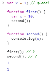 second 함수는 first 함수 내부에서 호출되었지만, second 함수가 선언된 곳이 전역이기 때문에 x를 찾는 스코프체인은 second() -> global 이 되어서 global의 1이 호출됩니다.