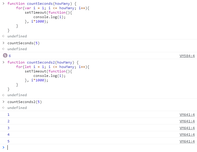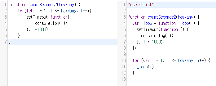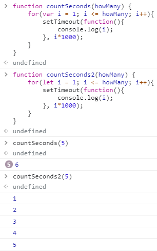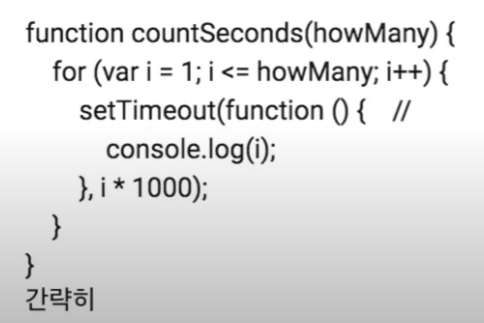 var는 for문에서 생성된 스코프가 아닌 countSeconds() 스코프에 있는 i를 참조하게 됩니다.