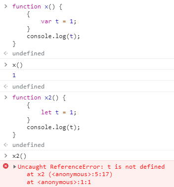 let은 중괄호 내에서 선언되어서 중괄호 밖으로 나가게 되면 인식할 수 없게 되는 것이죠.