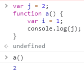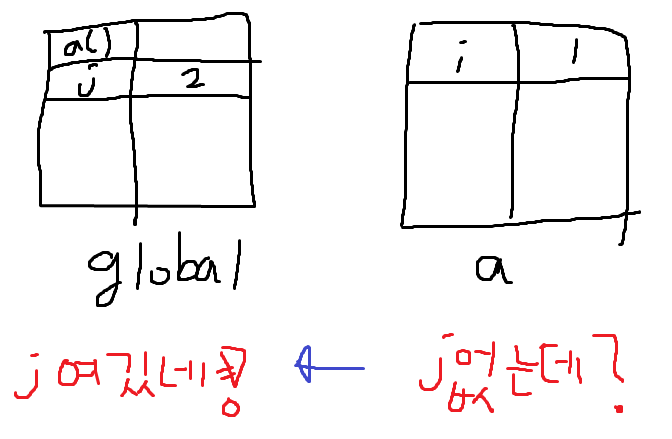 a() 스코프 내에 j가 없기 때문에, 자동으로 상위 스코프인 global 스코프에서 j를 찾아보게 됩니다.