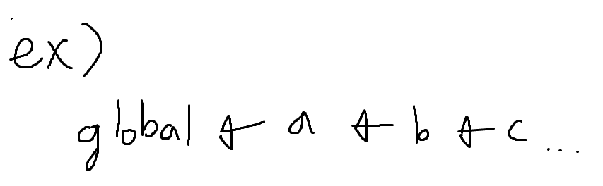 그리고 이렇게 상위 스코프로 이동하기 위한 경로는 연결리스트 형식으로 만들어지게 됩니다.