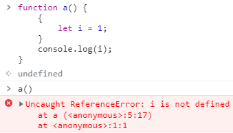 당연히 i는 a()안에서 선언만 되고 끝났기 때문에 i를 전역범위에서 막 사용할 수 없습니다.