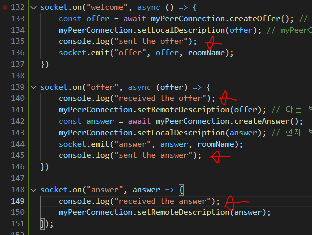 이전 포스팅에서 이미 방에 접속한 브라우저가 새로 접속한 브라우저에 offer를 날리는 부분까지 구현했었죠?