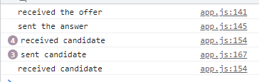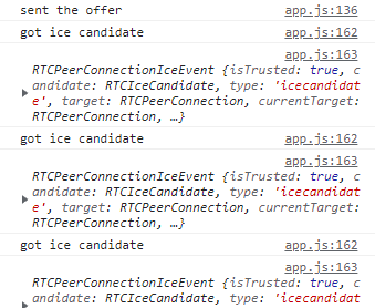 여기까지 만들고, makeConnection 과정에서 icecandidate 이벤트가 발생하면 데이터를 찍어보도록 만들었습니다.