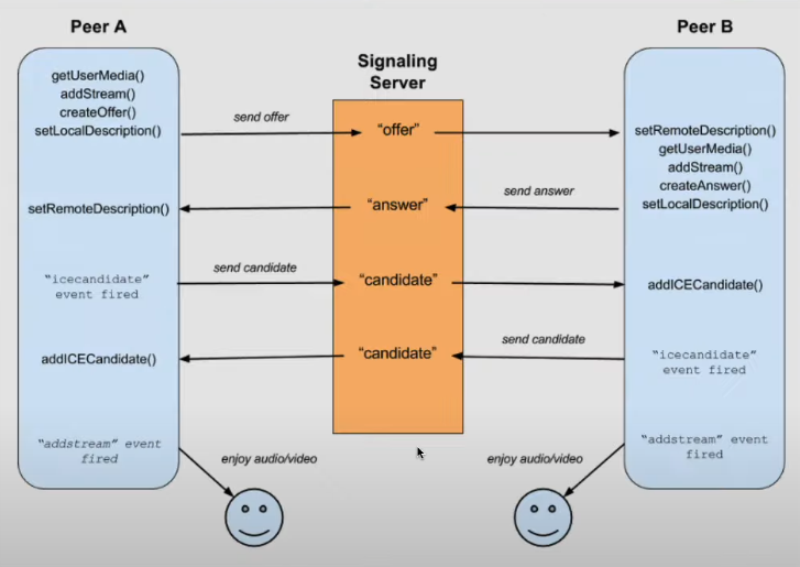 중간에 있는 getUserMedia와 addStream은 브라우저가 방에 접속할 때 작동하기 때문에 굳이 만져줄 필요가 없습니다!