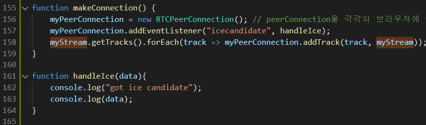 myStream.getTracks().forEach(track => myPeerConnection.addTrack(track, myStream)); // 영상과 음성 트랙을 myPeerConnection에 추가해줌 -> Peer-to-Peer 연결!!