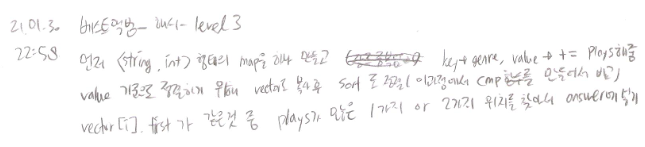 세 번째는 정렬한 vector의 순서대로 각 genres에서 가장 많이 재생된 곡(index)과 두 번째로 많이 재생된 곡을 찾아서 answer에 넣어줍니다. 이 과정에서 play값과 index값을 따로 저장해서 비교할 수 있도록 만들었습니다.